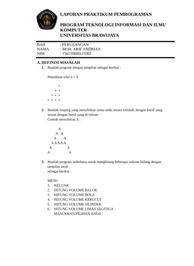 Pseudocode merupakan salah satu cara untuk menuliskan algoritma. 5) sebutkan dan jelaskan bahasa pemrograman berdasarkan fungsi kerja pada mesin . Yang terdiri dari perangkat lunak dan perangkat keras. Kegunaannya sama seperti output dari statement fmt.print(\n). Sebagai contoh pada program di .